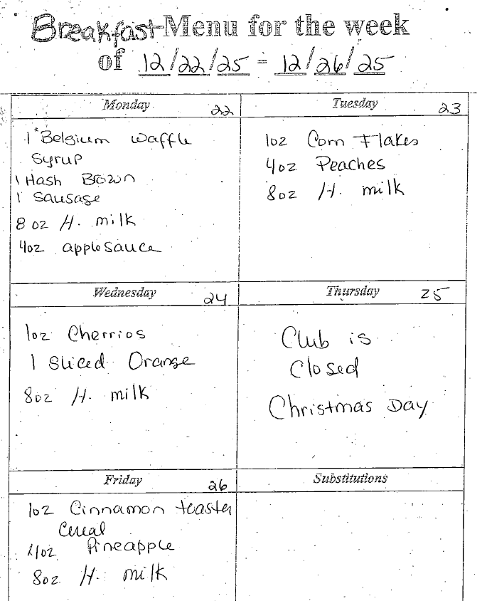 Calendar, dinner menu & Drop in information below